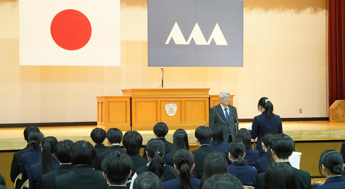 また、入会式終了後に南陽支部激励賞贈呈式が校長室で行われ、髙橋眞己支部長より、加藤花音さん・梅津若奏さん・遠藤愛斗さんに激励金と校訓額が贈られました。3名は探究学習のプレゼンテーションコンテストである「Change Maker Awards」の全国大会に出場し、英語で発表を行いました。