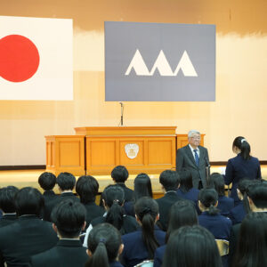 学年幹事に委嘱された長岡和佳葉さんから代表挨拶があり、記念品として校章入りの文鎮を贈呈したところです。
