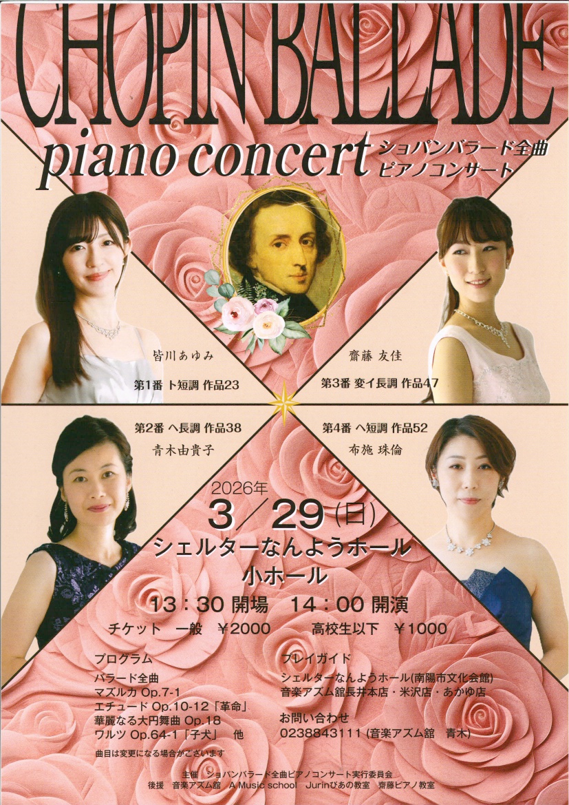 3月29日(日)、シェルターなんようホールにて「ショパンバラード全曲ピアノコンサート」が開催されます。4名のピアニストによるコンサートですが、布施珠倫さんは平成11年卒業の同窓生です。皆様、ぜひお聴きください。